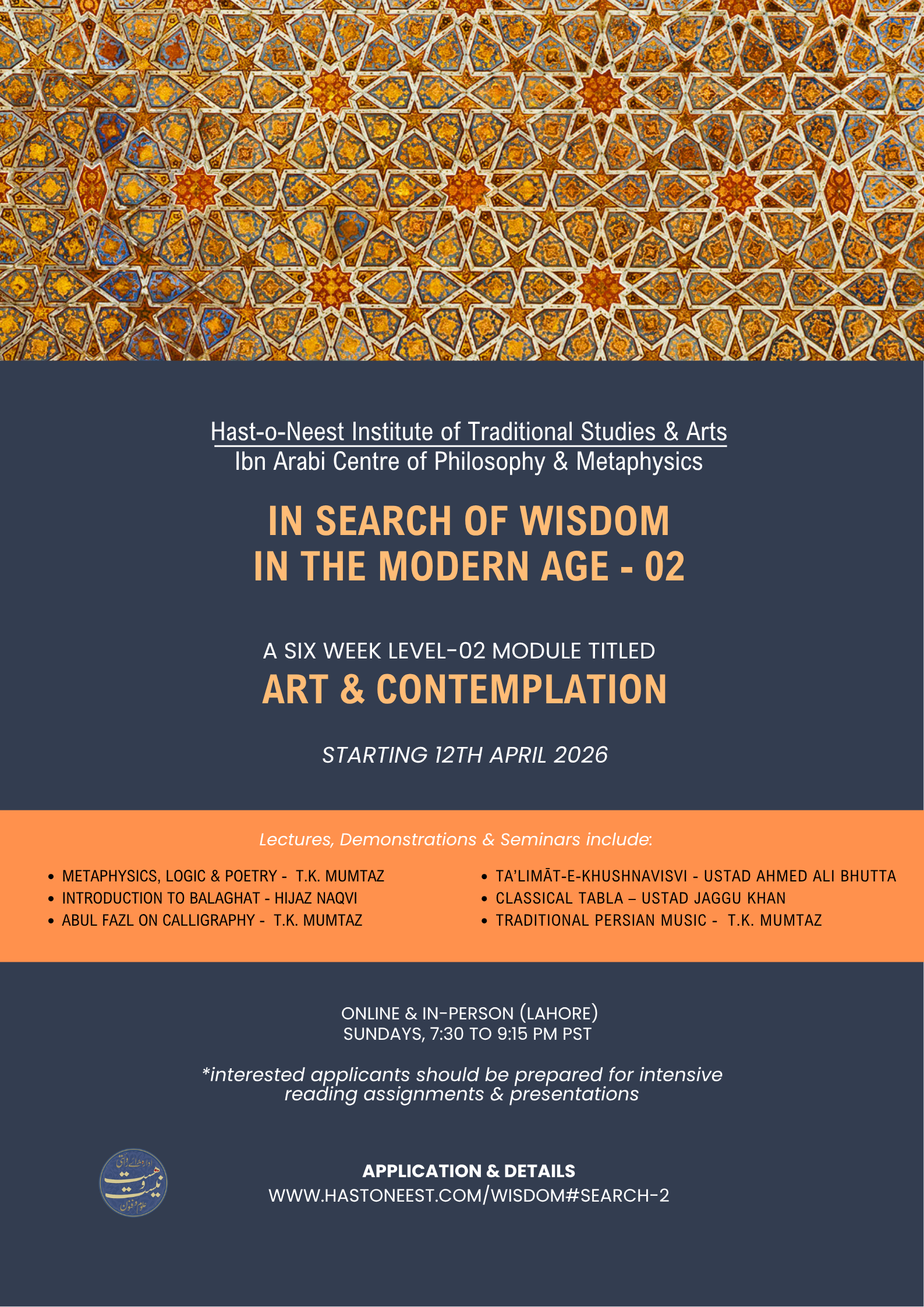 This course introduces participants to the Philosophy, World-view, Principles & Practice of Traditional (Pre-Modern) Art in general and the Islamic Arts of the Subcontinent in Particular.